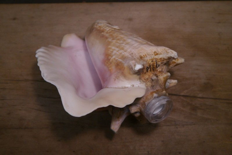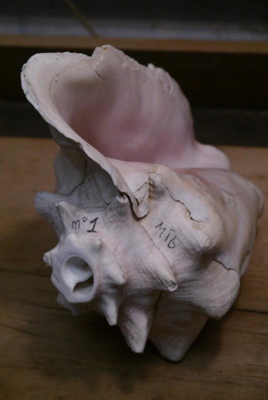 C'est à la demande de la Compagnie les Ombres Portées que j'ai adapté ces coquillages, pour leur spectacle La Renverse. Les musiciens de la compagnie ont chiné sur le net des conques diverses et variées, puis je les ai découpé de sorte à pouvoir y coller des embouchures plastiques ALEX développées par le CFMI de Lille, afin d'éviter tout risque d'allergie ou irritation (la plupart des embouchures de conques à lambis sont modelées avec de la pâte niclounivis ou truc du genre, qui ne donne pas envie d'y coller sa bouche).