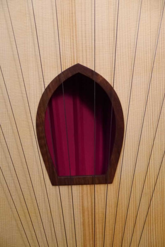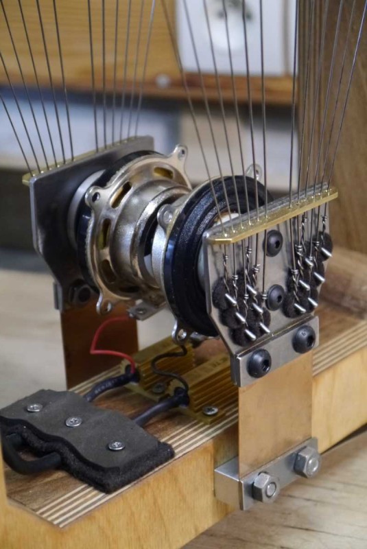 Les Palmes d'époque étant difficiles à trouver et très souvent en piteux état, à la demande de Cécile Lartigau qui est Ondiste, j'ai développé ce modèle de Palme. En effet, après avoir observé quelques Palmes de Maurice Martenot, mais aussi de son fils Jean Louis, j'ai eu envie de faire les chose différemment, et peut être aussi utiliser les ressources d'aujourd'hui: tenter d'améliorer la puissance sonore en augmentant la tension des cordes et en utilisant des moteurs d'aujourd'hui, plus puissant grâce à leurs aimants au néodyme, (cette terre rare qui est un des enjeux d'aujourd'hui). Ces moteurs, aussi plus légers, et permettent de s'accrocher seulement aux cordes, plus besoin de se fixer aussi au bâti comme sur les Martenot. Ainsi il y a moins de son direct et plus de son filtré par les cordes, donc plus d'expression du timbre des cordes. Autre transformation notable liée aux moteurs: la conception d'origine était basé autour de l'axe traversant du moteur; pour équilibrer les tensions sur l'axe du moteur, mais aussi sur la caisse de résonance, autant de cordes étaient tendues de part et d'autre de la caisse, d'où cette structure symétrique à 2 faces. Sur la Palmaurel, avec ce principe de moteur suspendu, j'ai pu dédier un moteur pour chacune des deux faces de l'instrument, ce qui permet d'envoyer deux signaux audio différents, et pourquoi pas de jouer avec des effets d'espace mouvant, avec des effets d'autopan etc.