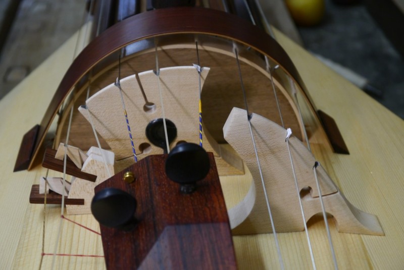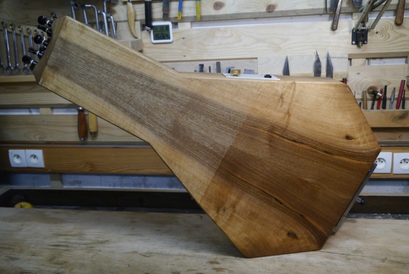 un développement de la puissance acoustique, avec une table large en épicéa, une nouvelle ergonomie, l’instrument peut soit être posé et jouer tout seul, soit être tenu proche du corps à la façon d’un violoncelle.